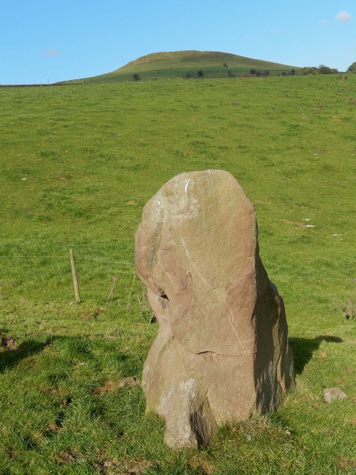 The second site we visited was a relatively unknown one, the Allgreave Menhir, which was discovered partially buried on land belong to Burnt House Farm and re-erected close to where it was found. It is about one mile south-east of the Bullstones and bears a resemblance to the great standing stones at the Bridestone Burial Chamber some 4.6 miles to the south-west (which we were to visit another day). The stone is on a north-south axis, with a flat face on the south side, a sun-face, and a tapering body of feminine curves to the north. On the west side we found a niche that contained carved indentations that fitted our hands. The reasons for the flat face and the niche are obviously lost to time, but I can think of a possible use, which I may include in my book and so won’t reveal at the moment.
