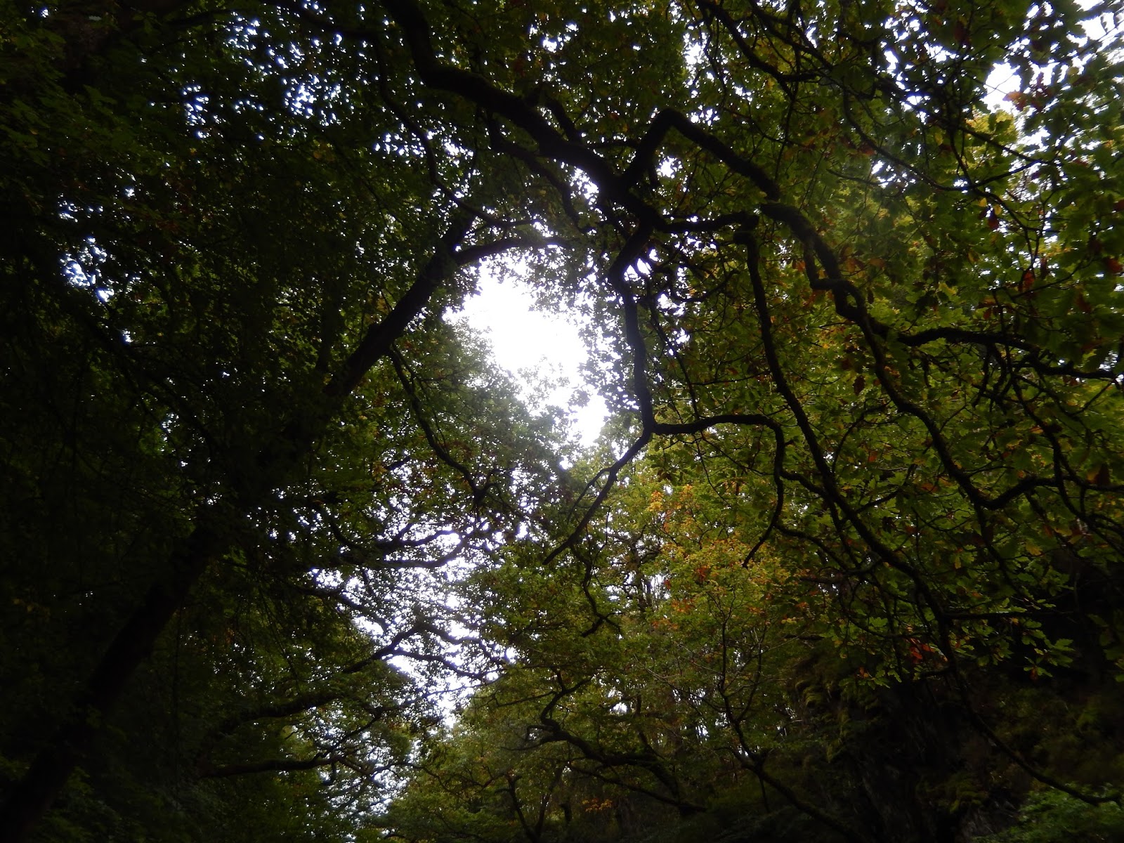 The Fairy Glen (known in Welsh as Ffos Ddofn, ‘deep ditch’) is as magical as the original postcard suggested. Canopy of berry-ladened rowans, autumning ash, oak and beech, even a single pine tree on an outcrop. Rocks worn through, over, around, streaked with fault lines. A stillness inside the echoing, tumbling, slapping, sluicing water, with its tracery lines of bubbles heading downstream.